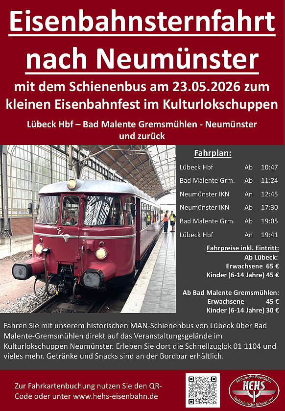 HIER: Reiseinformation und Fahrtbuchung für Zubringerfahrt mit Schienenbus VT25 von Lübeck über Malente-Gremsmühlen nach Neumünster
