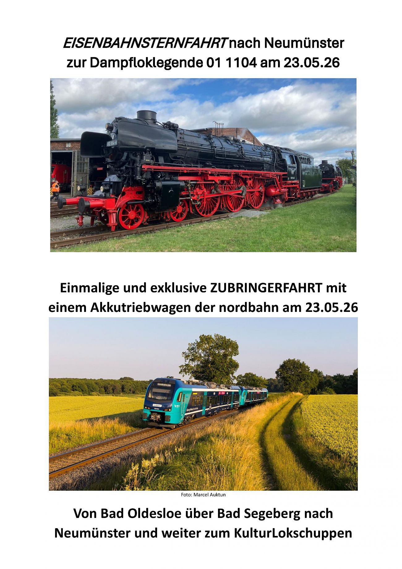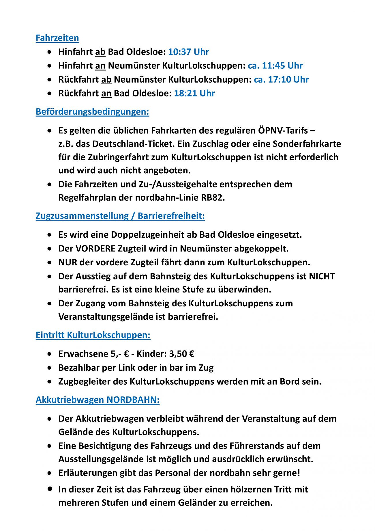 HIER: Eintritt KulturLokschuppen im Zusammenhang mit Zubringerfahrt von BAD OLDESLOE über BAD SEGEBERG nach Neumünster